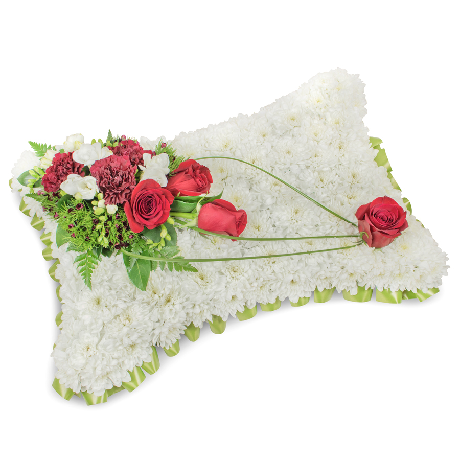 Show your deepest sympathies with our timeless sympathy flower arrangement. This elegant bouquet combines white chrysanthemums, red roses, white freesias, dark red carnations, dianthus, and bear grass, carefully selected and arranged to honor your sentiments.